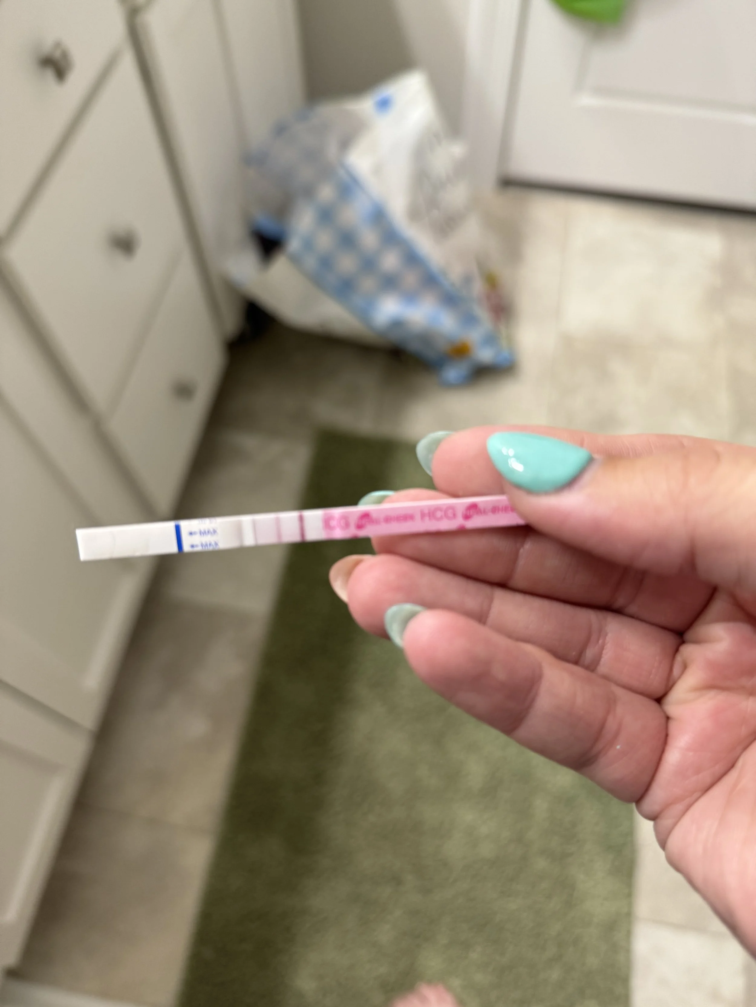 That evening I told myself, “I’ll just take a test. It would be cool to find out on Mother’s Day… I can’t get my hopes up.” My hands were shaking as I waited, already rehearsing how I’d comfort myself when it was negative again. But almost immediately, two pink lines appeared. I stared in disbelief. I took another… and another… five tests in total, all positive.